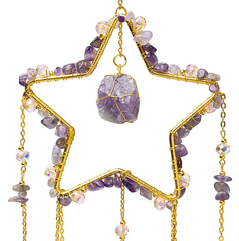 Der Sonnenfänger aus Diamant- und Amethystkristall ist ein wahres Energiejuwel, das Licht einfängt und schillerndes Funkeln in Ihrem Raum verbreitet. Er besteht aus facettierten Kristallen , Amethystfragmenten und einem violetten und transparenten Kristallstern und hängt an einer eleganten goldfarbenen Metallstruktur, die eine geometrische Harmonie aus Diamanten bildet.