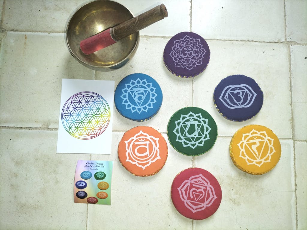 - Legen Sie jede Klangschale auf das Kissen, das dem zugehörigen Chakra entspricht.