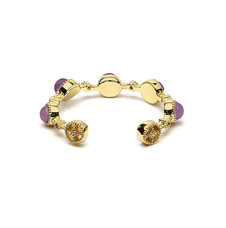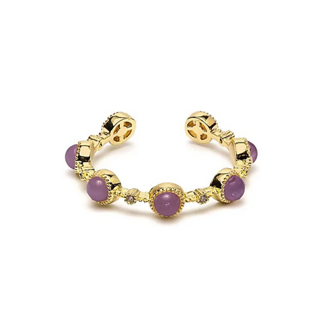 La pierre centrale, d’un diamètre d’environ 2 cm, révèle des nuances allant du violet clair translucide au pourpre plus profond. Pierre de sagesse et d’intuition par excellence, l’améthyste diffuse une énergie douce et stabilisante, propice à l’apaisement mental et à la connexion spirituelle.