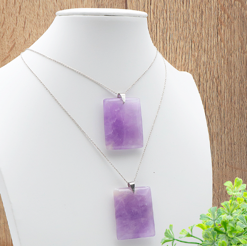 La forme rectangulaire apporte une sensation de stabilité et de verticalité, mettant en valeur la profondeur naturelle de la pierre. Chaque pendentif est unique, révélant des variations subtiles de teinte et de transparence propres à l’améthyste. Monté avec une bélière discrète, il peut être porté sur une chaîne fine ou plus affirmée selon le style recherché. Ce pendentif s’adresse à celles et ceux qui recherchent un bijou à la fois apaisant, structuré et intemporel.