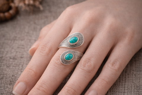La bague “Souffle d’Azur” se distingue par son design enveloppant et texturé, sublimé par une turquoise naturelle aux nuances bleutées intenses et aux veinures chaleureuses. Confectionnée en argent 925 massif, elle affiche un style à la fois bohème, ethnique et raffiné, associant élégance intemporelle et caractère solaire. Les teintes vibrantes de la turquoise qualité AA, oscillant entre bleu ciel et vert d’eau, illuminent la surface finement travaillée du métal, créant un bijou lumineux au charme authentique.