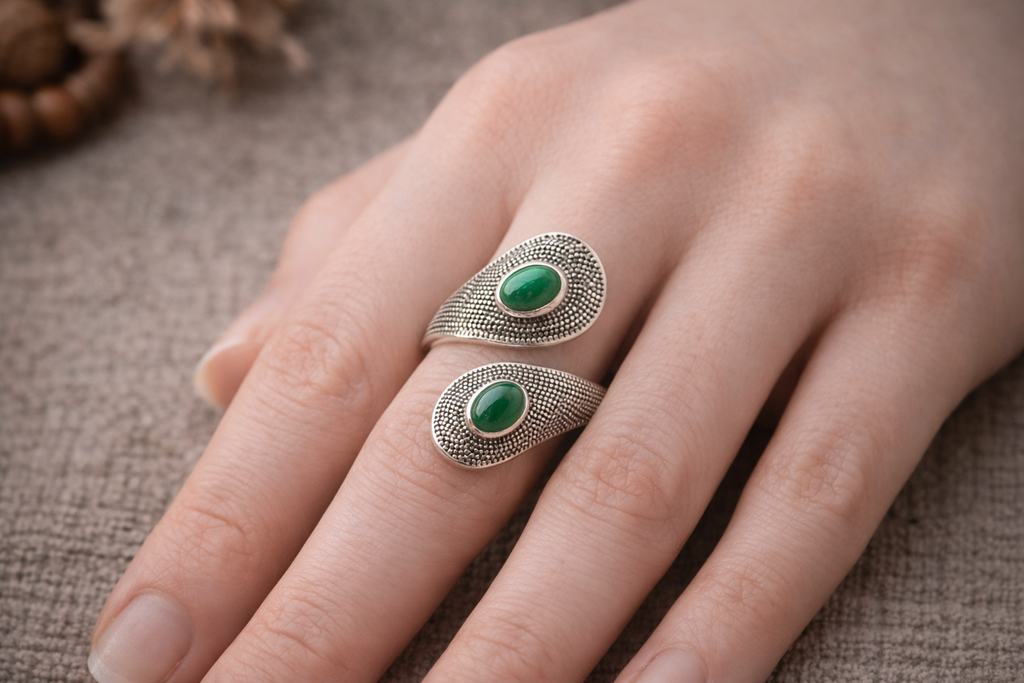 La bague “Spirale d’Émeraude” en argent 925 et malachite est une création qui allie puissance visuelle, transformation intérieure et protection énergétique. Sa pierre aux motifs circulaires hypnotiques en fait un bijou à la fois magnétique et intemporel. Elle accompagne le porteur dans ses cycles de changement, de libération émotionnelle et de renaissance personnelle, tout en apportant une touche profonde et élégante à chaque tenue.