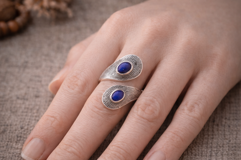 La bague “Voile d’Orient” se distingue par son design enveloppant et texturé, magnifié par un lapis lazuli naturel aux nuances bleu profond constellées de paillettes dorées. Confectionnée en argent 925 massif, elle révèle un style à la fois mystique, raffiné et intemporel, offrant un équilibre subtil entre élégance orientale et caractère affirmé. Les reflets célestes du lapis lazuli qualité AA viennent sublimer la surface finement travaillée du métal, créant un bijou d’exception, intense et lumineux.