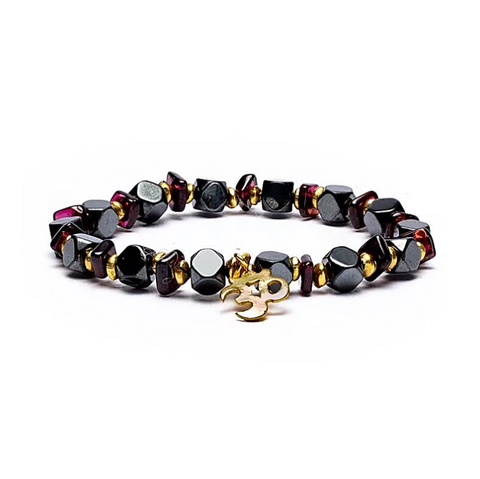 Ce bracelet associe la force magnétique de l’hématite à l’énergie vibrante du grenat pour former un bijou à la fois élégant et puissant. Monté sur un fil élastique pour s’ajuster facilement à votre poignet, il est orné d’un symbole Om doré, incarnation du son primordial de l’univers. À porter au quotidien comme un rappel de votre force intérieure et de votre paix spirituelle.