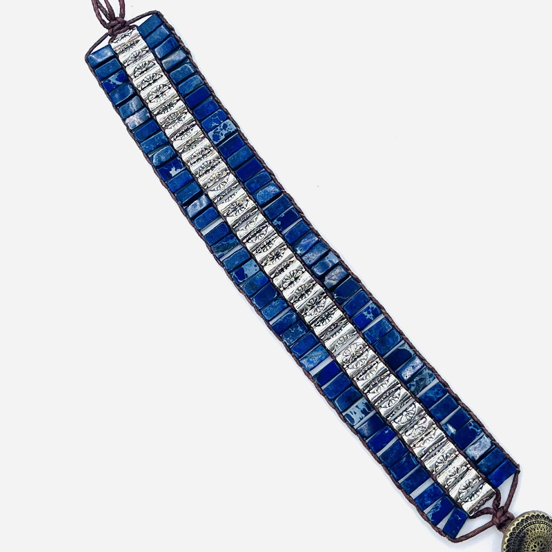 - Matériaux : pierres naturelles de sodalite, métal argenté gravé, lien en cuir véritable