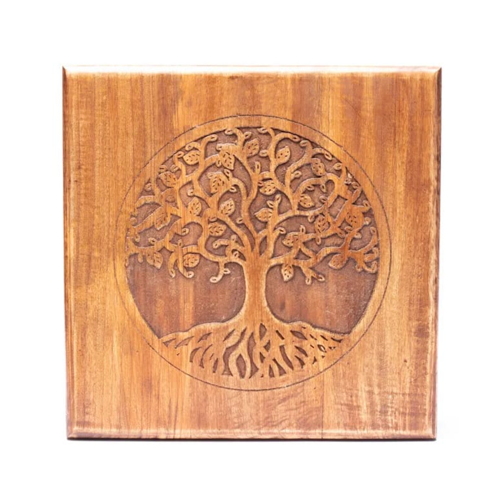 Élégante et profondément symbolique, cette table d’appoint en bois d’acacia se distingue par sa gravure délicate de l’Arbre de Vie, symbole universel de la croissance, de la prospérité et du cycle éternel de la naissance, de la mort et de la renaissance.